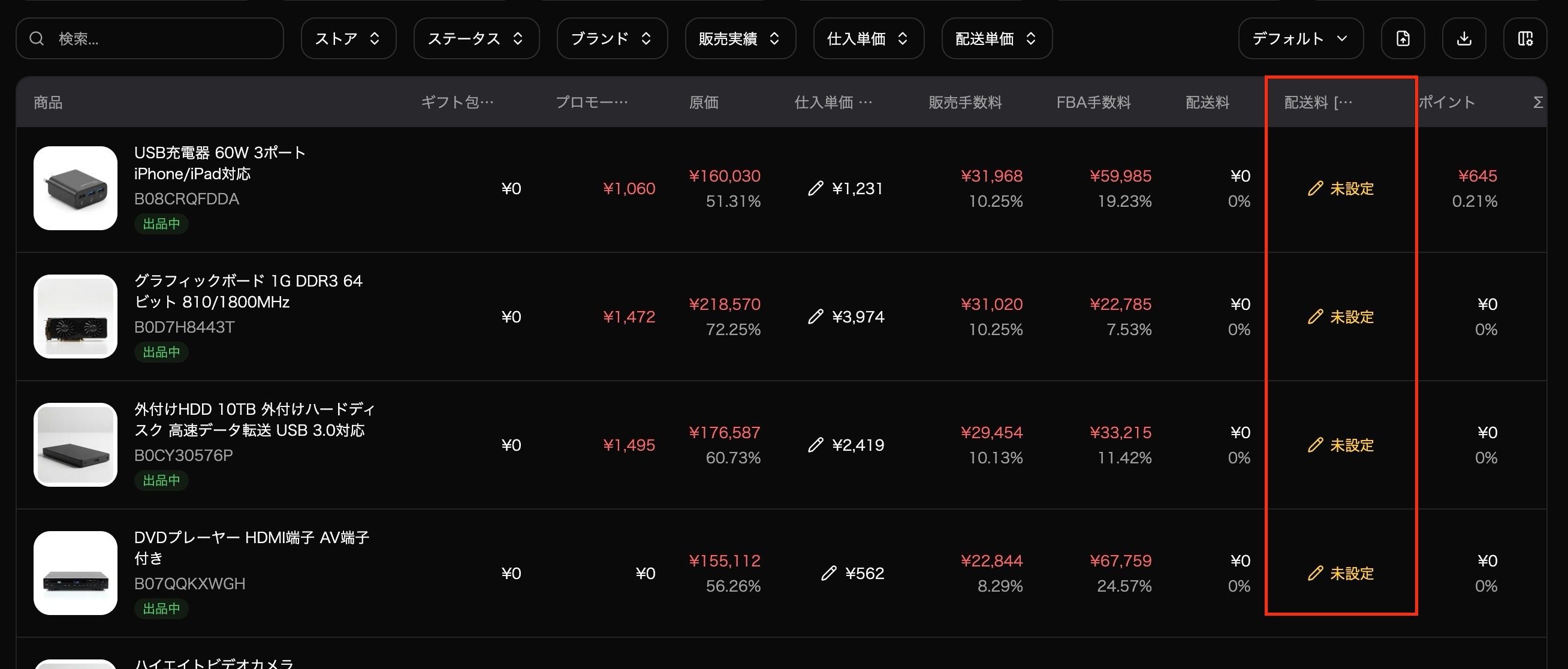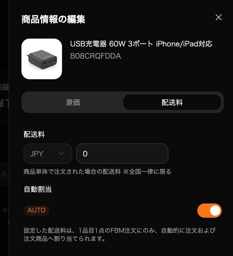 商品に配送料を設定しておくと、自動割当機能を使って将来の注文に自動で配送料を適用できます。なお、この設定はFBM(自社配送)の注文に対して適用されます。